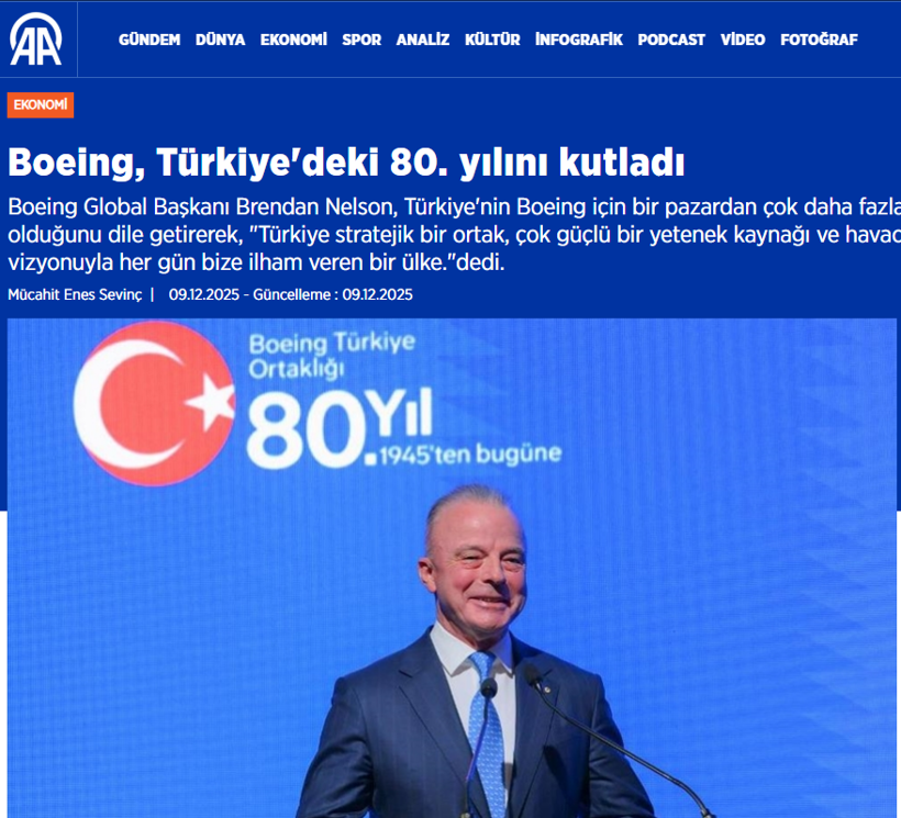 Boeing’in 80. yıl gecesini haber yapan ajans, Boeing’in, Türkiye’nin havacılık tedarik zincirine yaptığı yatırımlarla iş hacmini artırırken, ihracat ve istihdam artışına katkıda bulunduğunu ve Türkiye’nin küresel havacılık değer zincirlerinde yükselişini desteklediğini aktardı.