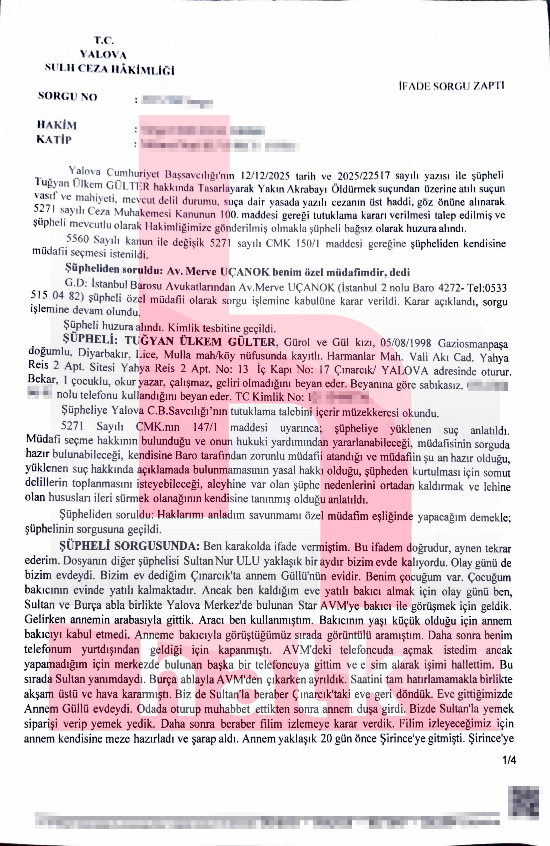 Savcı, Tuğyan Ülkem Gülter‘i “tasarlayarak kasten yakınını öldürme” suçundan tutuklanması talebiyle sulh ceza hâkimliğine sevk etti. Gülter tutuklandı. Halktv.com.tr Gülter’in hem savcılık hem de karakol ifadesine ulaştı.