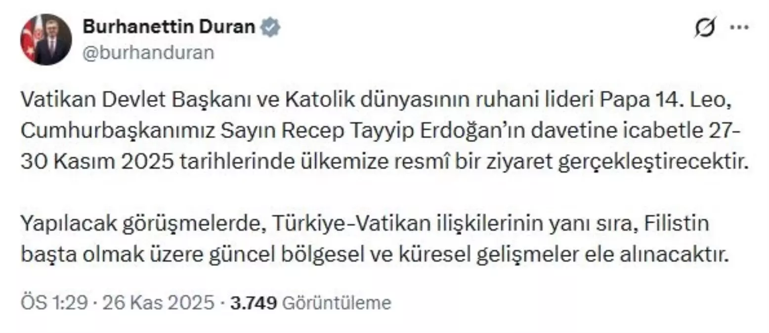 İletişim Başkanı Duran, sosyal medya hesabından yaptığı açıklamada, “Vatikan Devlet Başkanı ve Katolik dünyasının ruhani lideri Papa 14’üncü Leo, Cumhurbaşkanımız Sayın Recep Tayyip Erdoğan’ın davetine icabetle 27-30 Kasım 2025 tarihlerinde ülkemize resmi bir ziyaret gerçekleştirecektir. Yapılacak görüşmelerde, Türkiye-Vatikan ilişkilerinin yanı sıra, Filistin başta olmak üzere güncel bölgesel ve küresel gelişmeler ele alınacaktır” dedi.