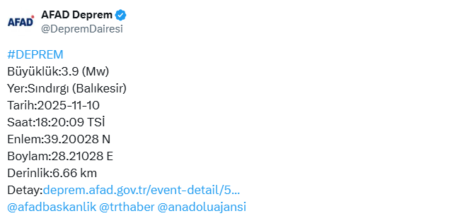 AFAD’ın verilerine göre, ilçede 3.9 büyülüğünde bir deprem kaydedildi. Merkez üssü Sındırgı ilçesi olarak tespit edilen deprem, yerin 6.66 kilometre derinliğinde gerçekleşti.